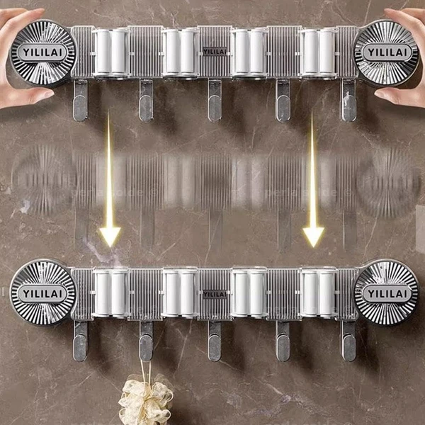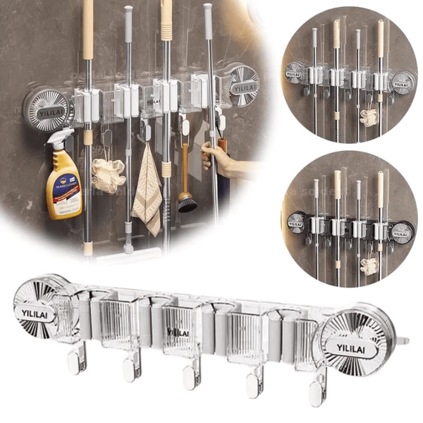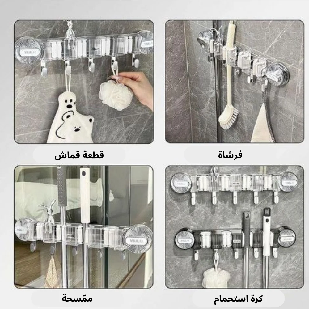 يمكن استخدامه لتعليق المكنسة، الممسحة، المجرفة، وغيرها من أدوات التنظيف بكل سهولة.